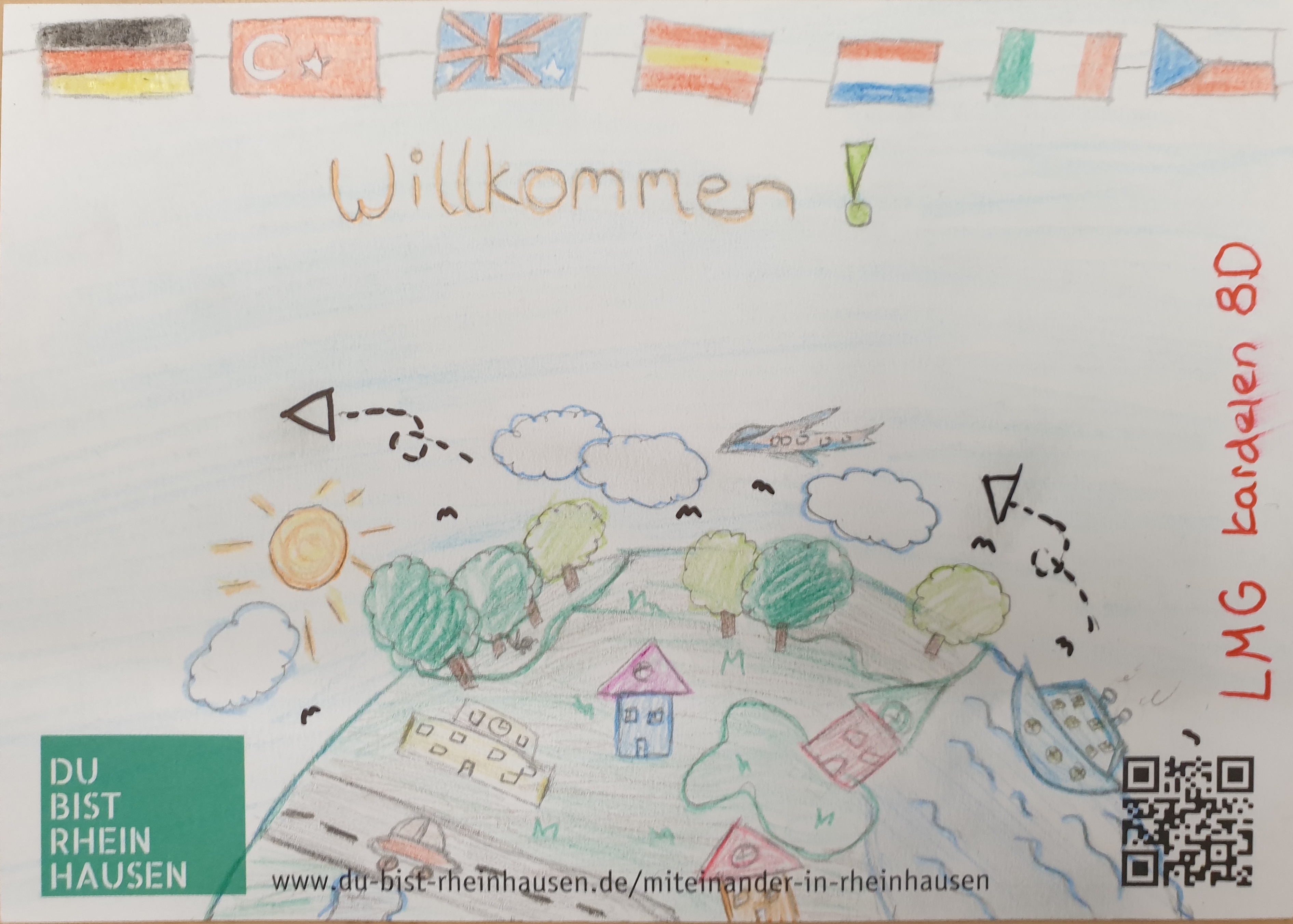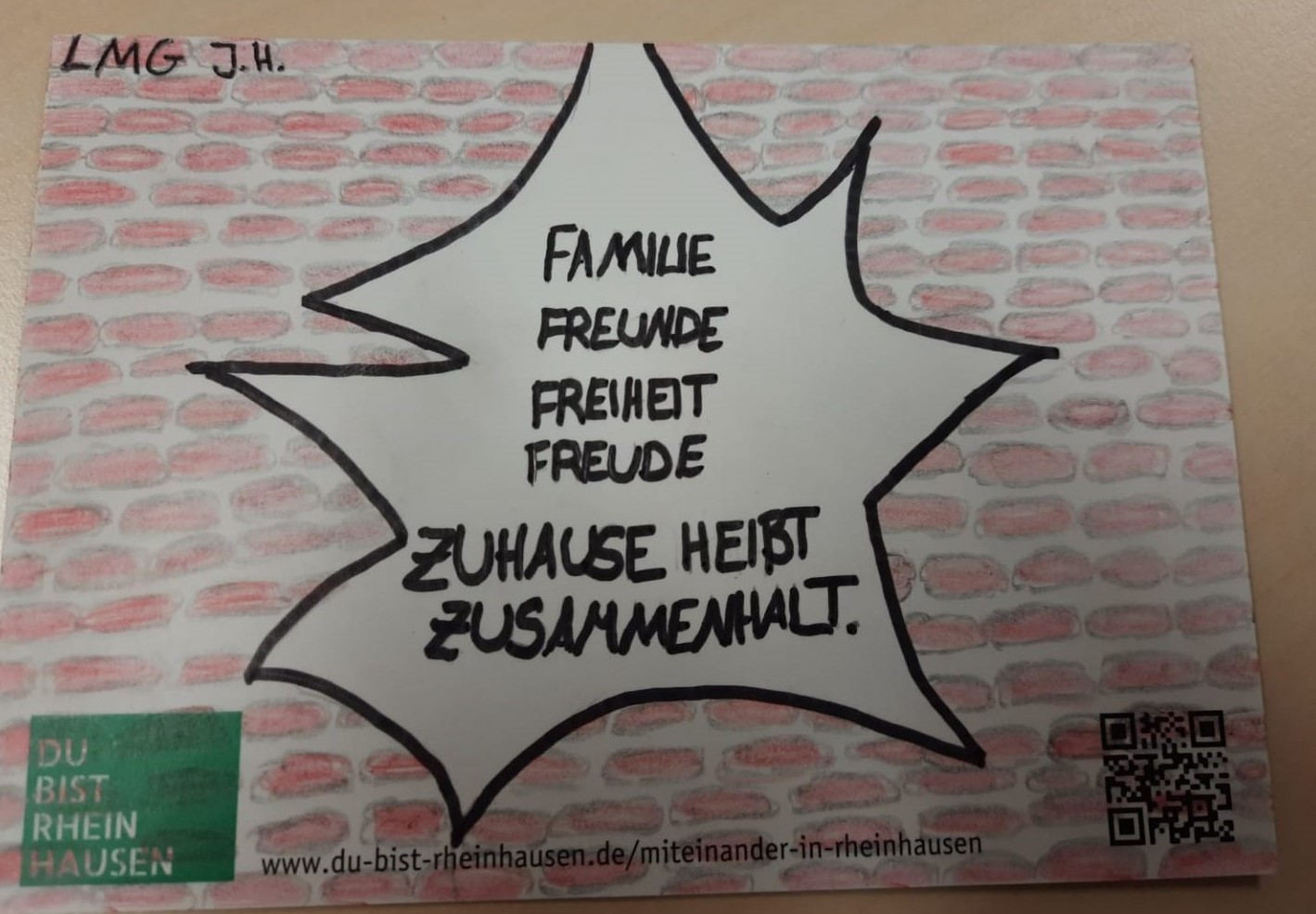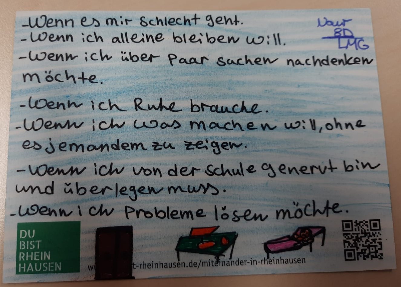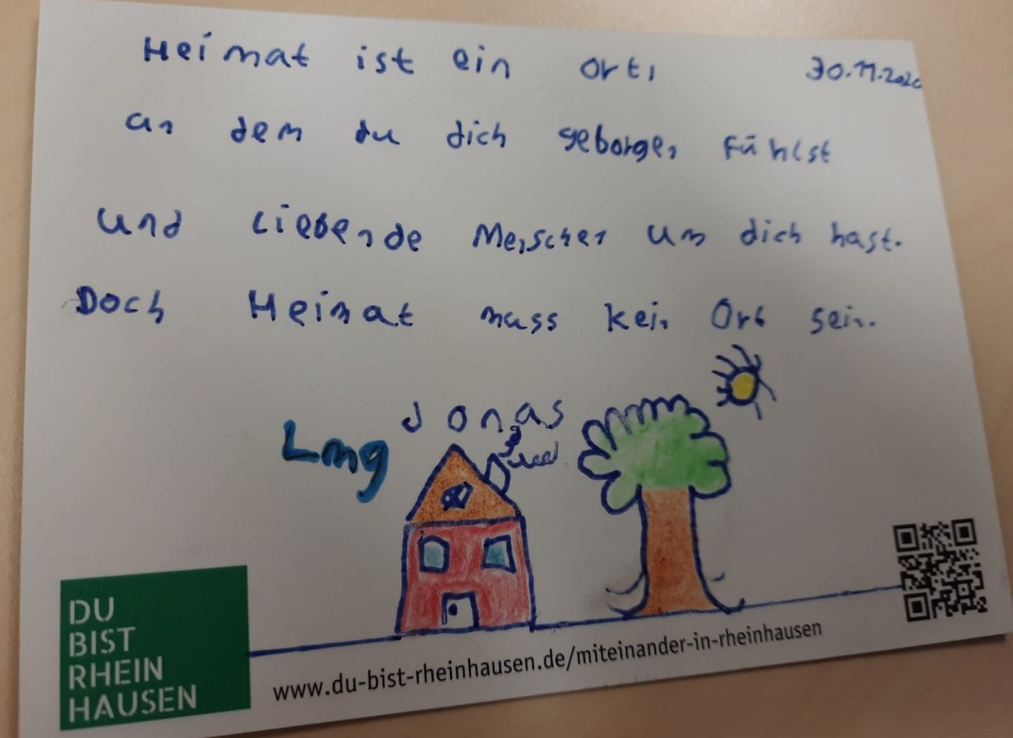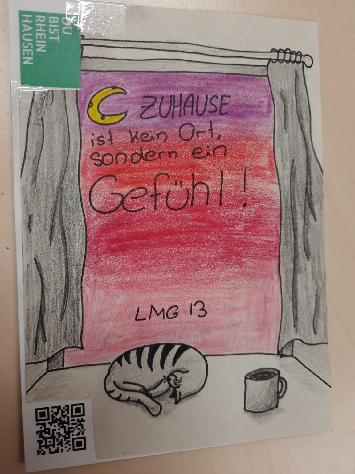 “Wann ist zuhause?” Das war die Frage, die die Bürgerinitiative “Du bist Rheinhausen” den Schülerinnen und Schülern der Lise-Meitner-Gesamtschule gestellt hat. Ist das Zuhause ein Ort, ein Gefühl, eine Person oder gar eine Situation? Jahrgangsübergreifend haben sich hierzu viele Schülerinnen und Schüler Gedanken gemacht, was es für sie bedeutet, sich wirklich daheim zu fühlen. Auf der Rückseite einer Postkarte haben sie alle ihrer Kreativität freien Lauf gelassen, diese sehr persönliche und zum Nachdenken anregende Frage schriftlich oder zeichnerisch zu beantworten.