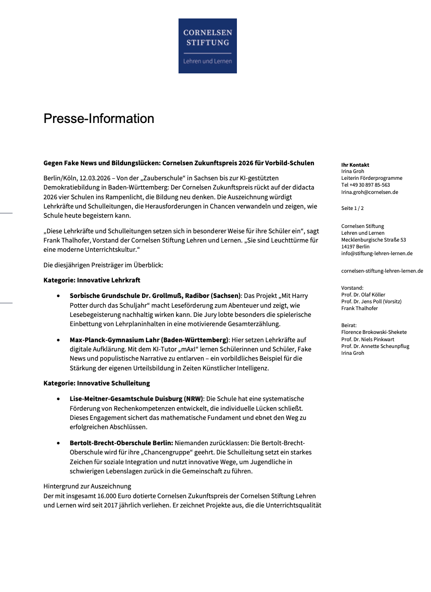 Die Lise-Meitner-Gesamtschule ist mit dem Zukunftspreis “Innovative Schulleitung” der Cornelsen-Stiftung: Lehren-und-Lernen ausgezeichnet worden.